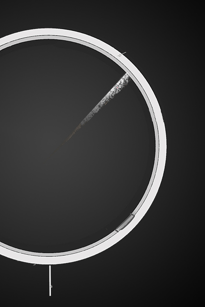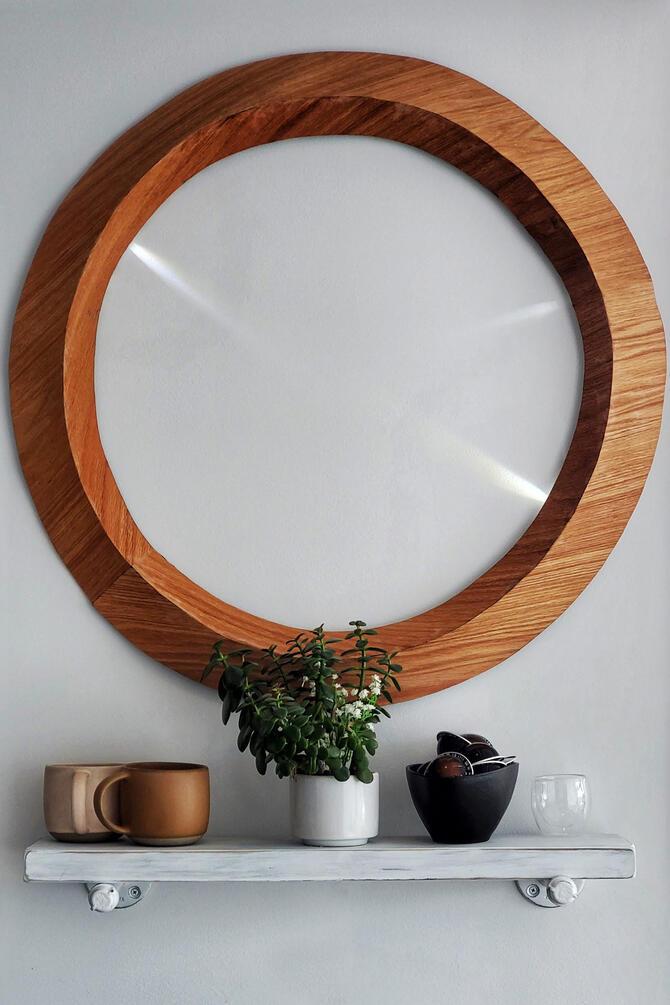 The natural beauty of a handmade red oak frame displaying time with the elegance of minimalist cold white light beams to remind us of our scarcest resources.