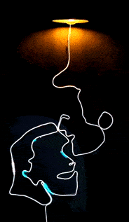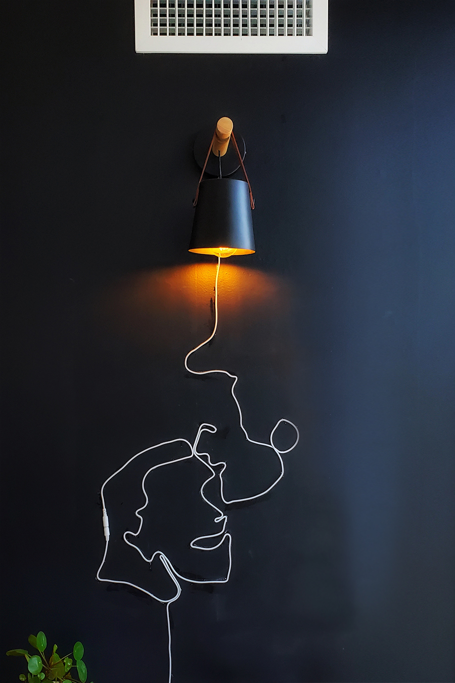 In its pursuit to free us from our own limitations, technology brought a new dependence: electrical power. Tethered to our cables, or anxious about finding one when our batteries run low, we are addicted to the electrons that flow through the copper syringes. What if we could give more meaning to those new chains? "Konnection" answers that question. Instead of hiding it, this sculpture blatantly showcases the cable and gives it another depth. Through a line art, it depicts a couple united under a warm halo, letting the viewer witness a love that is, this time, untethered.