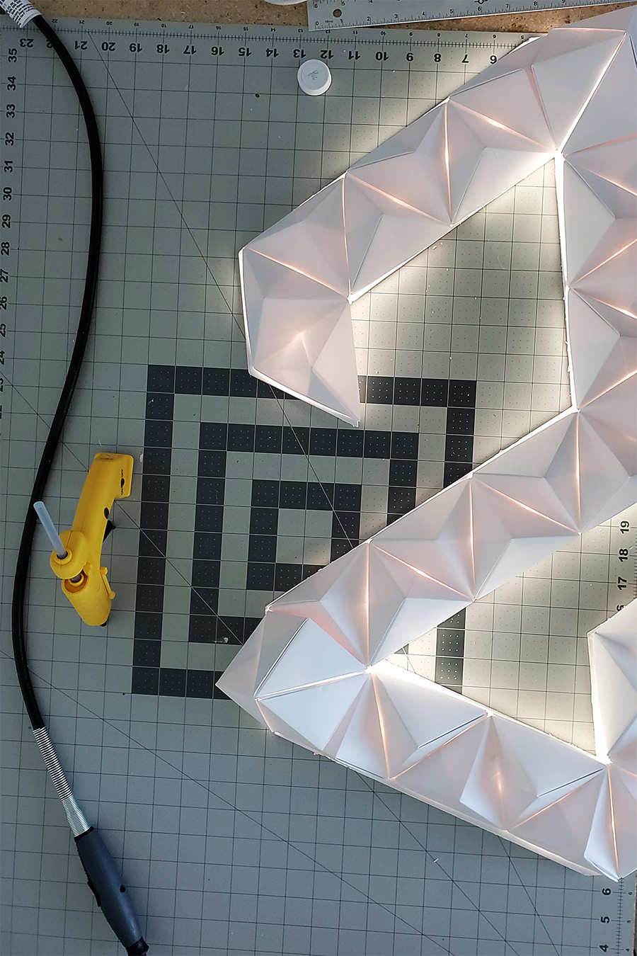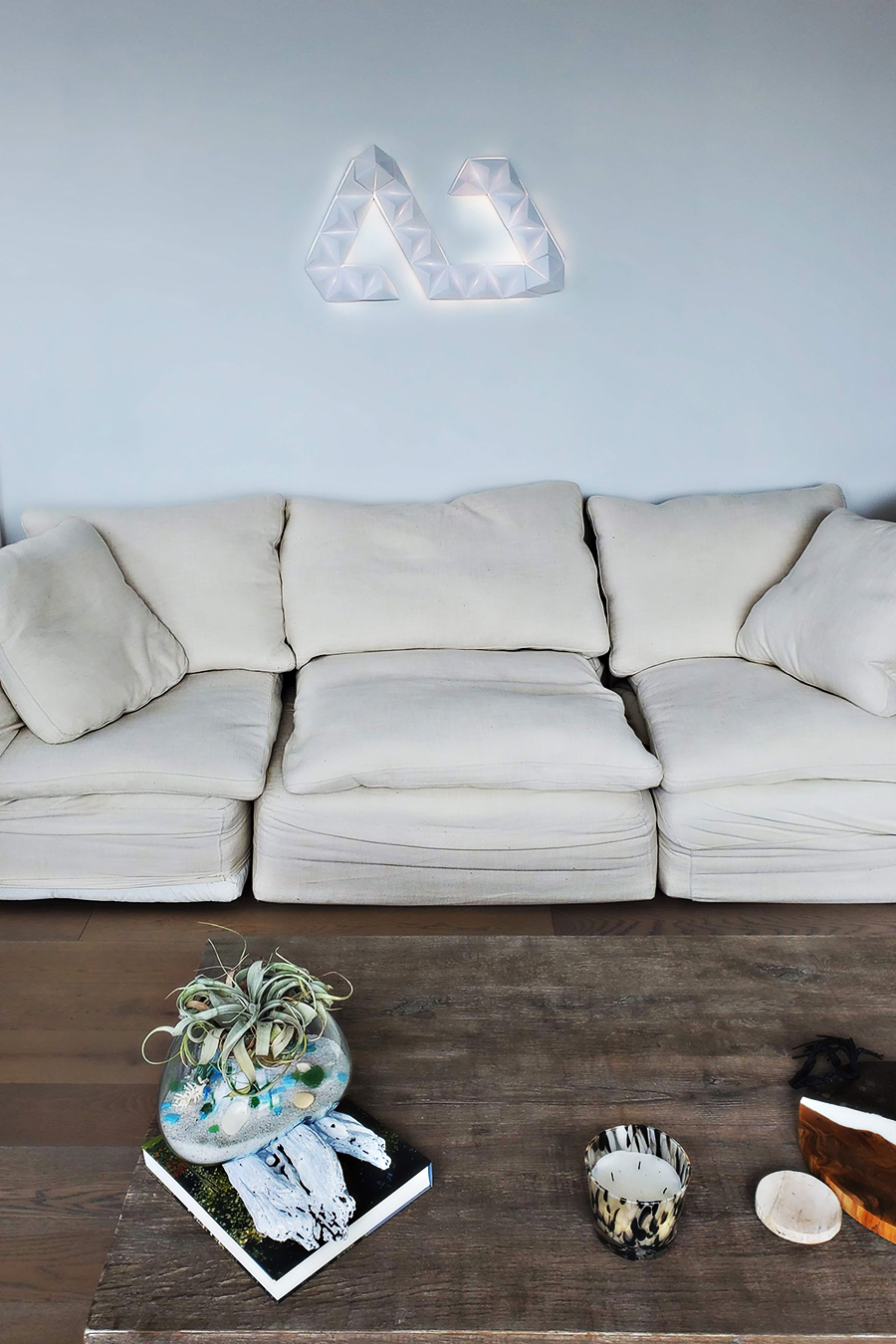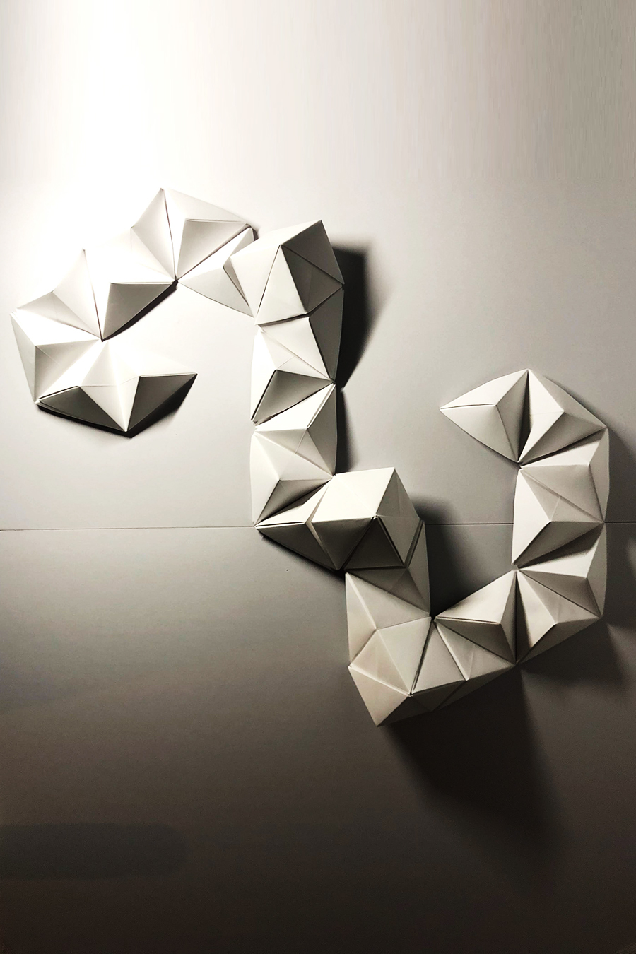 Thus is born "Paperkut": an origami-made sculpture equipped with lighting that transforms the piece as time passes by. When off, the object adorns an interior with an infinity-shaped geometric artwork. And with a simple press on a remote button, the user can breathe life into that paper sculpture which appears to be suddenly floating above a moving rainbow of colors.